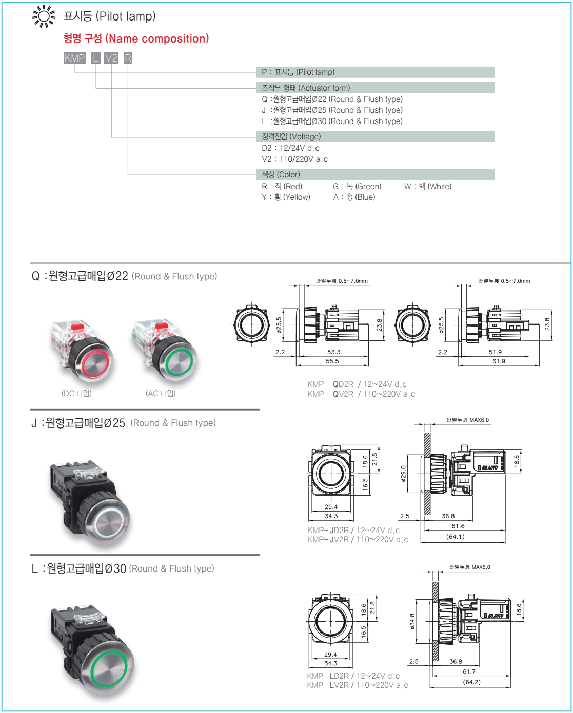 Pilot lamp ( KMP SERIAL ) Ø22, 25, 30 KMP- QD2, KMP- QV2, KMP-JD2, KMP-JV2, KMP-LD2, KMP-LV2,